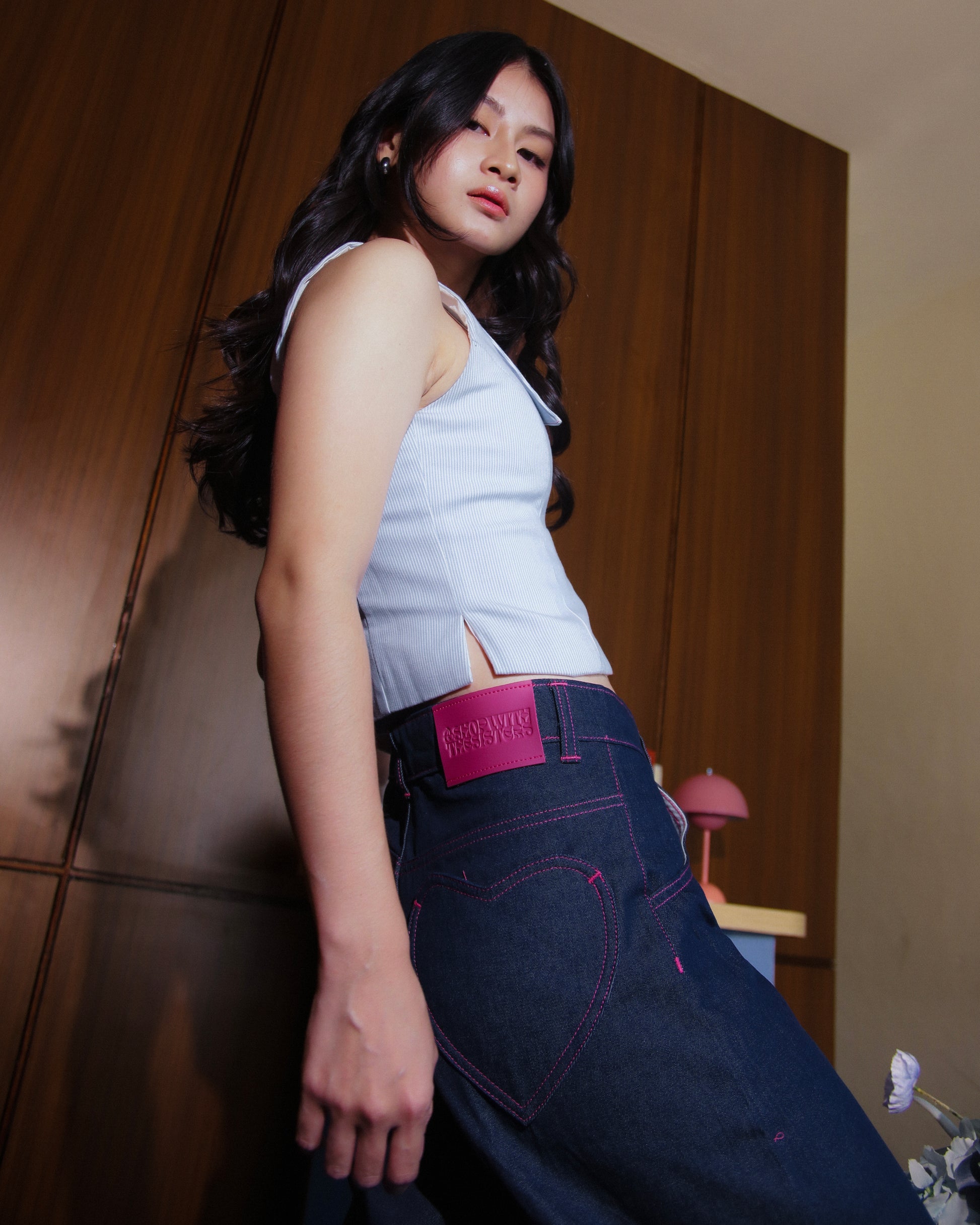 Double Heart Denim Jeans (Pink Stitching)