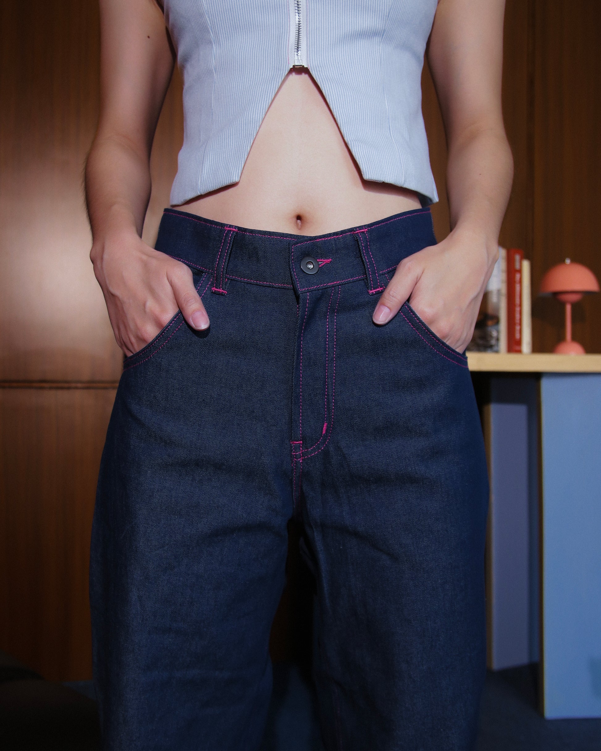 The Double Heart Denim Jeans combine unique design with expert craftsmanship, featuring a signature heart-shaped back pocket that merges style and function. Crafted from blue raw denim, the jeans showcase striking pink contrast stitching for a bold, refined look. Designed to sit comfortably at the waist, these jeans offer a wide straight leg cut that delivers both a modern silhouette and lasting comfort. Ideal for those seeking distinctive denim with a tailored fit and standout detailing.