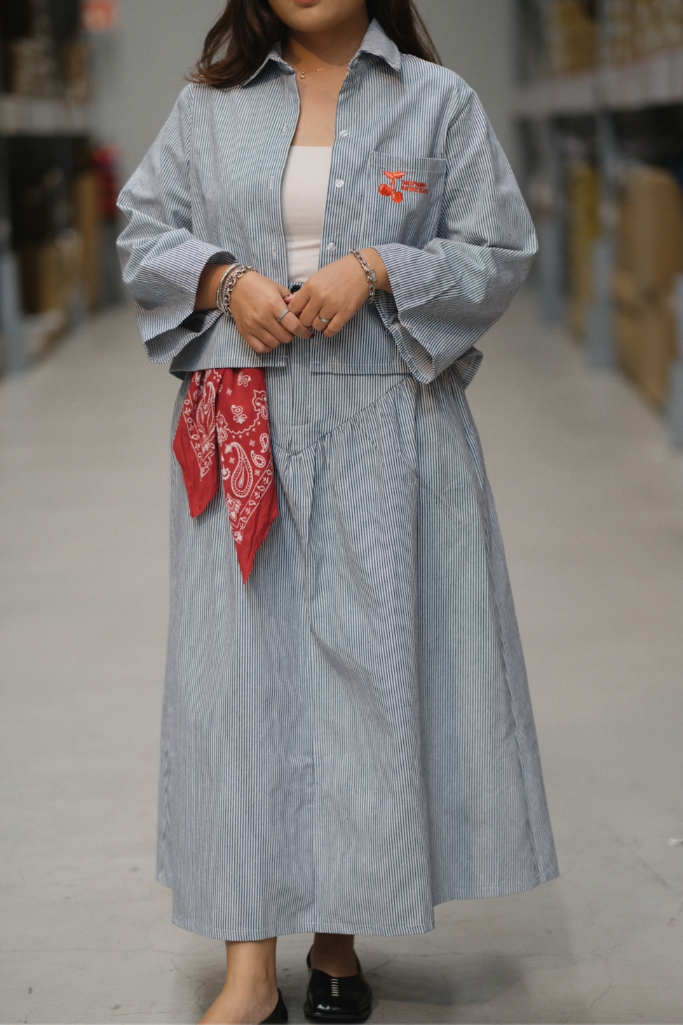 Evie Pinstripes Denim Skirt features classic vertical pinstripe detailing with a refined aesthetic. An embroidered logo adorns the left side pocket, adding a signature touch of sophistication. The back waistband incorporates stretch fabric for enhanced comfort and ease of movement throughout the day. This versatile midi skirt seamlessly transitions from casual to polished occasions, offering both style and practical wearability.