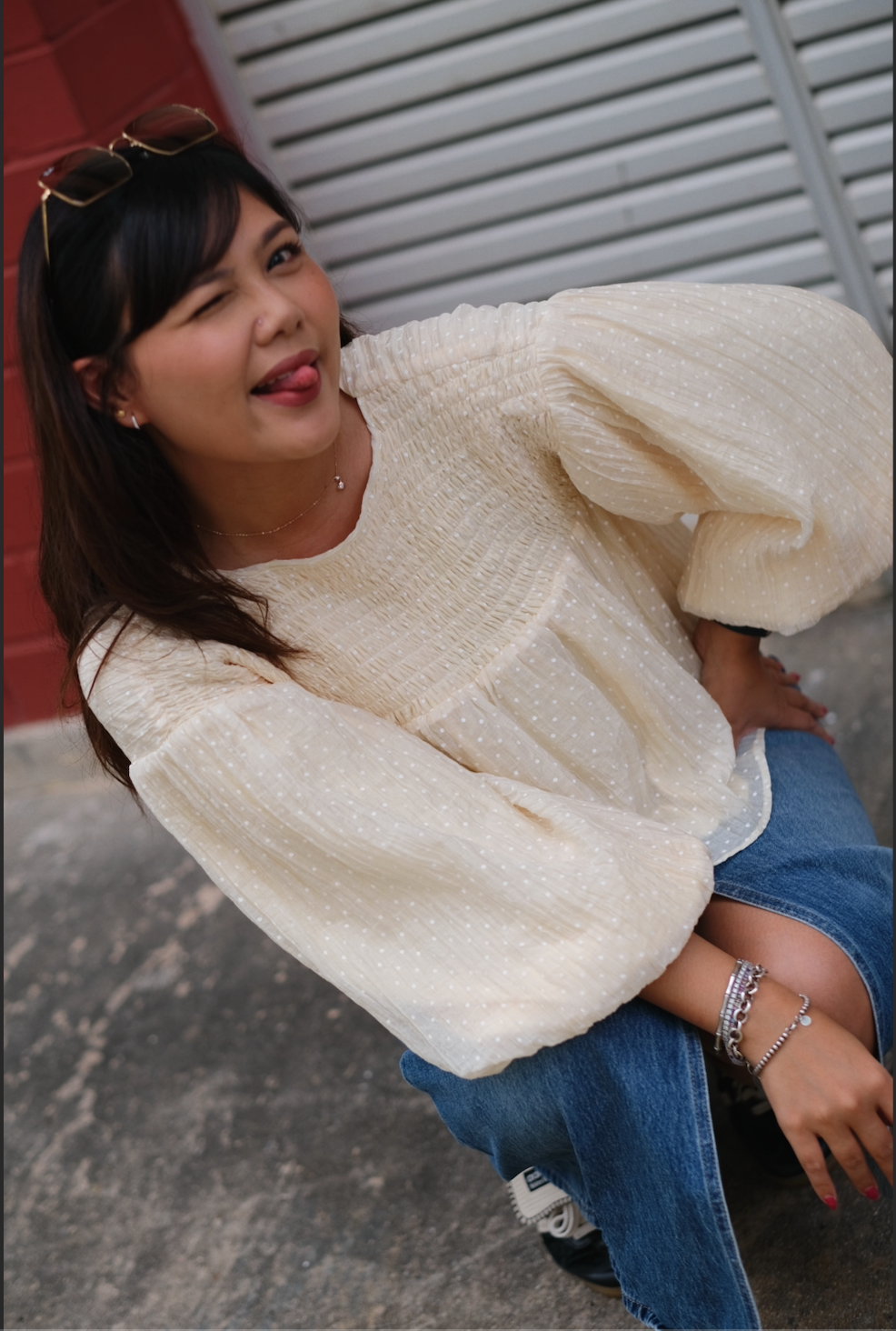 The Malia Blouse in Polka features a skillfully smocked bodice that enhances the silhouette with a gentle flare. Crafted from sheer polka dot fabric, it includes a comfortable lining for modesty and ease of wear. The balloon sleeves, detailed with delicate gathers, add volume and elegance.
